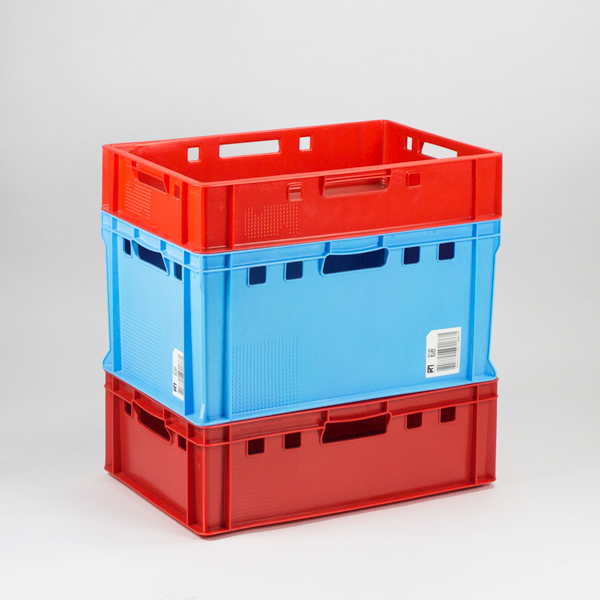 - E-Line, caja en plástico apilables perforado, adecuado para la industria alimentaria.