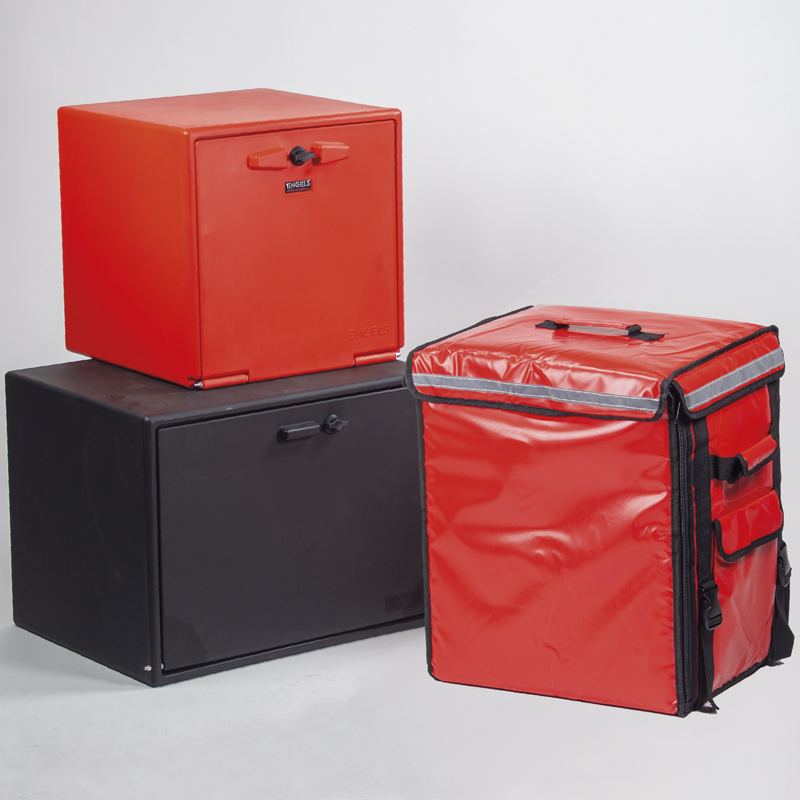 Circular y aparcar en el centro de las ciudades es ahora una pesadilla. Por eso, la distribución de mercadurías, pizza y sushi se realiza cada vez más en vehículos de dos ruedas. Para responder a estas necesidades Engels ha desarrollado una gama de cajas de reparto para scooters y bicicletas (eléctricas). El modelo superior se fabrica por moldeo rotacional en polietileno de baja densidad LLDPE.