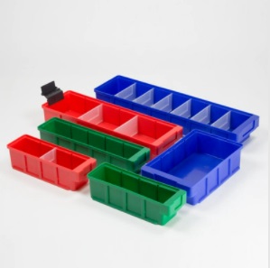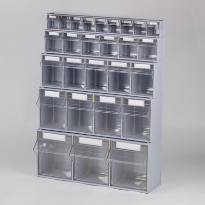 Los cajas basculantes son transparentes por lo que se puede identificar rápidamente su contenido. Con accesorios como armarios, carros y soportes de pared, los contenedores basculantes se pueden apilar hasta 2 metros de altura. La capacidad varía entre 1 y 20 litros. Los soportes para los contenedores basculantes se pueden adquirir individualmente o en conjuntos de 2 a 9 cajas. Son muy utilizados en farmacias y tiendas de bricolaje.