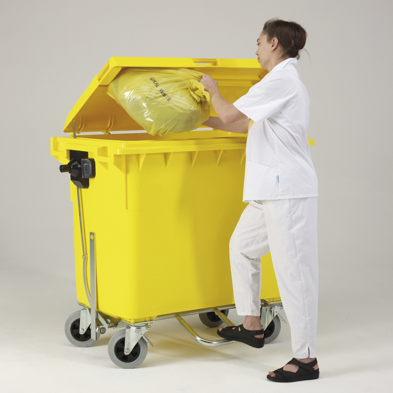 Nuestros contenedores de 240, 660 y 770 litros reforzados, con cierres, están testados para la homologación UN y aprobados para el transporte de residuos hospitalarios como embalajes combinados con nuestras bolsas resistentes e identificables (si se cierran adecuadamente). Nuestros contenedores de residuos (tanto de 2 como de 4 ruedas) se pueden equipar con diversos accesorios para un sector industrial específico, como los sistemas de acoplamiento, para que se puedan llevar detrás de un sistema de remolque como un tren.