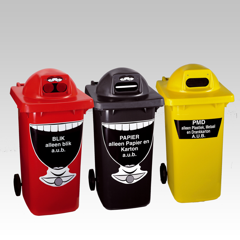 Los contenedores de residuos también pueden estar provistos de una cubierta redonda (tipo iglú) y una abertura con válvula de sellado contra los olores e insectos. Los parques temáticos y festivales generan muchos residuos. Al usar contenedores de colores vivos con caras divertidas, llamamos la atención de los visitantes (jóvenes). Estos contenedores están disponibles con 3 tipos de tapas y diferentes pegatinas.